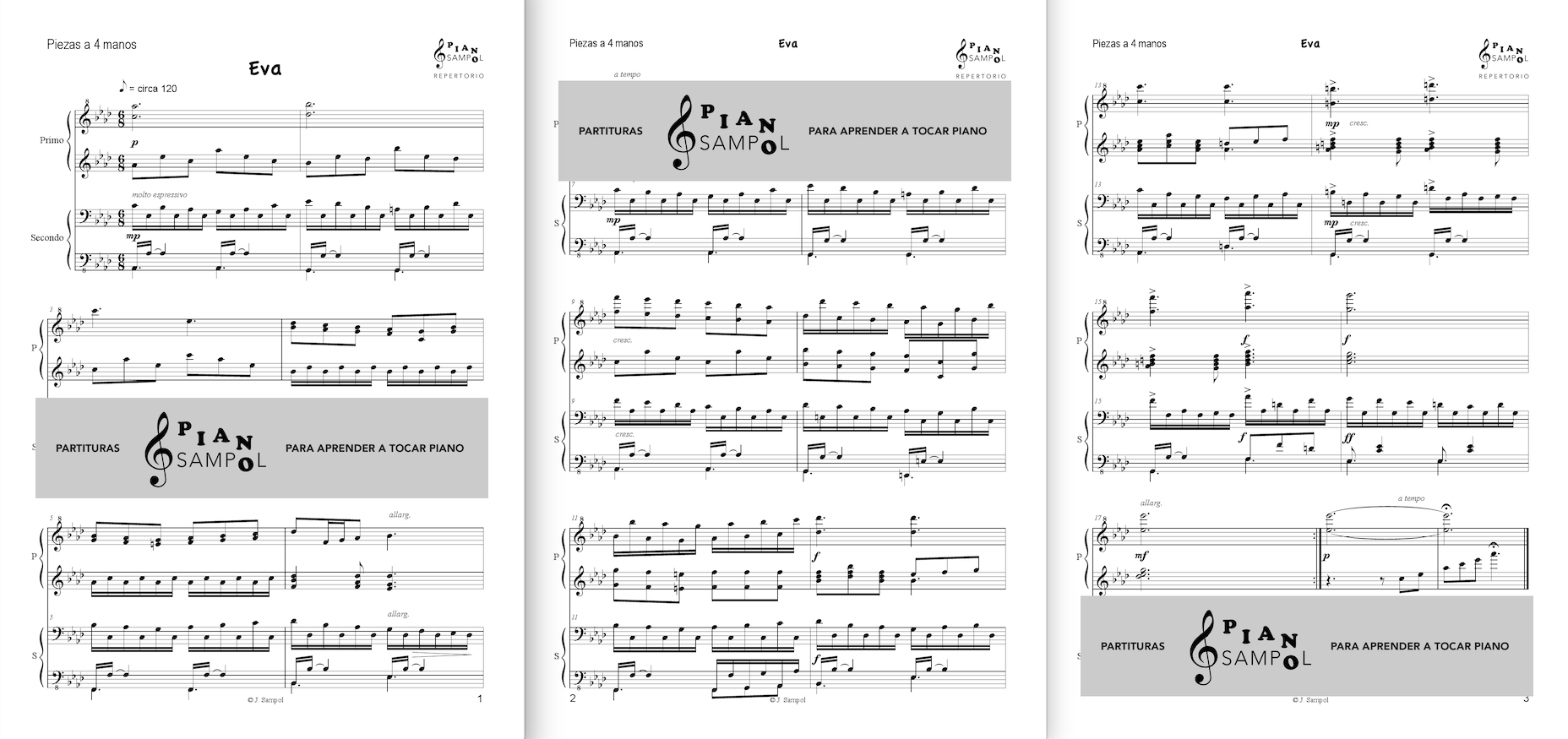 Este producto incluye tres partituras: Partitura general (3 páginas) + piano Primo (2 páginas) + piano Secondo (2 páginas).