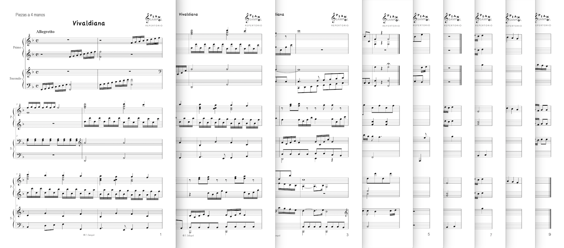 Este producto incluye tres partituras: Partitura general (9 páginas) + piano Primo (6 páginas) + piano Secondo (5 páginas).